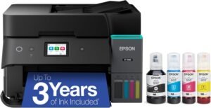 The printer with refillable tanks and up to three years of ink is a versatile and reliable choice for home printing needs. With fast print speeds, a user-friendly touchscreen, an auto document feeder, and wireless connectivity, it combines efficiency, convenience, and cost-effectiveness in a compact and modern design. Whether for students, families, or small home offices, this printer ensures consistent performance, low maintenance, and a significant reduction in printing costs over time.